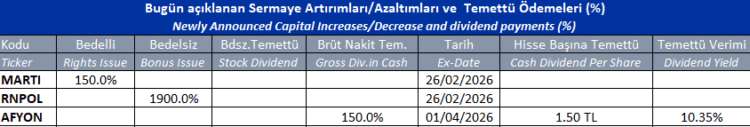 Gün içinde çıkmış veya bu sabah seans açılmadan önce açıklanmış sermaye artırımları ve temettü ödemeleri aşağıdaki tabloda görüntülenmektedir.