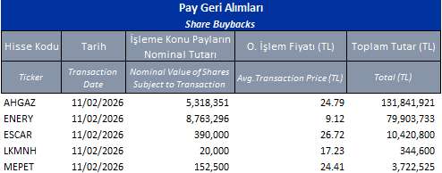 ENERY (ALIM)-(GERİ ALIM) : Şirketimizce 11.02.2026 tarihinde Borsa İstanbul'da pay başına ortalama
