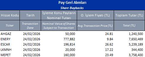 ENERY (ALIM)-(GERİ ALIM) : Şirketimizce 23.02.2026 tarihinde Borsa İstanbul'da pay başına ortalama