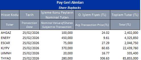 25,48-25,62 TL fiyat aralığından toplam 200.000 TL nominal değerli AHGAZ payları geri alınmıştır.