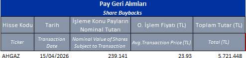23,08-23,24 TL fiyat aralığından toplam 350.000 TL nominal değerli AHGAZ payları geri alınmıştır.