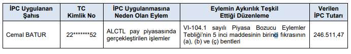 Sermaye Piyasası Kurulu (SPK), Alcatel Lucent Teletaş Telekomünikasyon AŞ (ALCTL) pay piyasasında gerçekleştirilen işlemler ile ilgili olarak bir kişiye idari para cezası verildi.