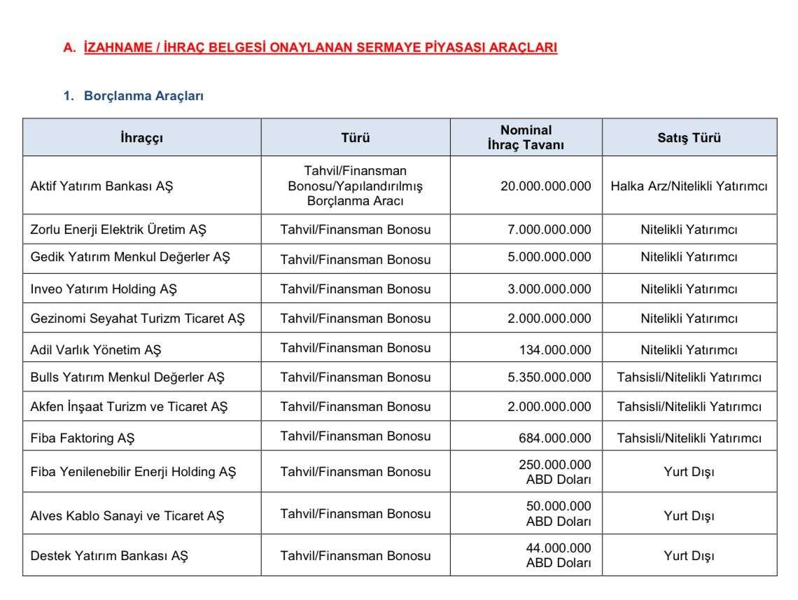 SPK haftalık bülteninde yer alan karara göre, onaylanan borçlanma aracı ve kira sertifikaları şu şekilde: