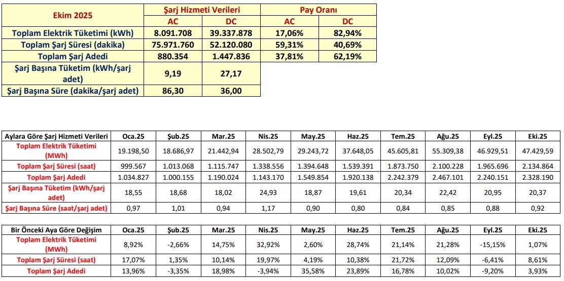 Ekim ayı verilerine göre, ülke genelinde 36.361 adet şarj noktasında (soketinde) toplam 2.328.190 adet şarj işlemi gerçekleştirilmiştir. Bu işlemler sonucunda 2.134.864 saate karşılık gelen toplam şarj süresiyle birlikte 47.429 MWh düzeyinde elektrik tüketimi gerçekleşmiştir.