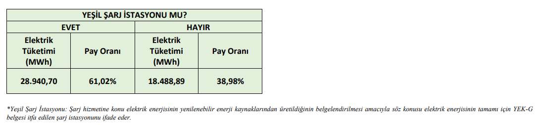 Gerçekleşen toplam elektrik tüketiminin yaklaşık %61’lik kısmı, kullandığı elektrik enerjisinin %100’ü yenilenebilir enerji kaynaklarından sağlandığı YEK-G (Yenilenebilir Enerji Kaynak Garanti) Belgesi ile belgelendirilen yeşil şarj istasyonlarında gerçekleştirilmiştir.