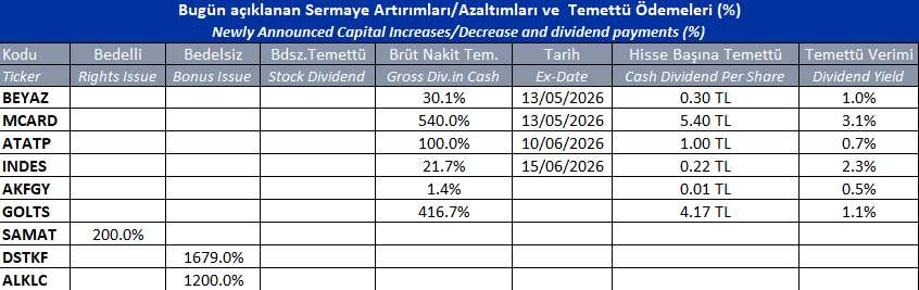Gün içinde çıkmış veya bu sabah seans açılmadan önce açıklanmış sermaye artırımları ve temettü ödemeleri aşağıdaki tabloda görüntülenmektedir.