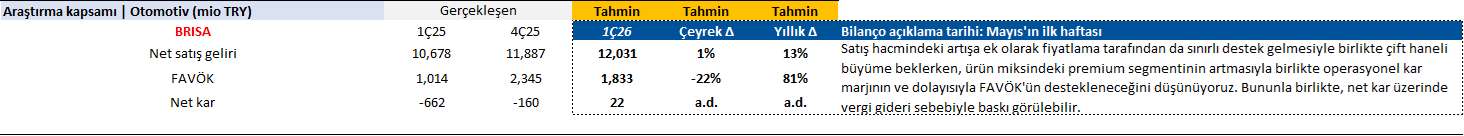 Brisa (Olumlu; Öneri: Öneri Yok) 4Ç15'te 76 milyon TL net kar açıkladı; açıklanan rakam piyasa (58 milyon TL) beklentisinin üstünde geçekleşti. Şirket'in 4Ç15 cirosu yıllık %8'lik artışa tekabül etmekte ve 519 milyon TL olarak gerçekleşti. Düşen hammadde fiyatları sayesinde SMM'de düşüş gösterdi ve %2 oldu. Operasyonel tarafta, yönetim giderlerinin de genel itibariyle kontrol altında olması sayesinde FAVÖK beklentilerin üzerinde gerçekleşti. Rakam 129 milyon TL olarak açıklanırken, piyasa beklentisi olan 109 milyon TL'nin üzerinde gerçekleşti. Operasyonel olmayan ve finansal giderleri de içeren giderlerin toplamı 12 milyon TL oldu ve şirket 4Ç15'te 76 milyon TL net kar açıkladı. Kar beklentilerin ötesinde gerçekleştiği için kar rakamlarının hisse performansını pozitif etkilemesini bekliyoruz.