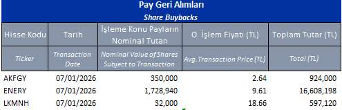ENERY (ALIM)-(GERİ ALIM) : Şirketimizce 06.01.2026 tarihinde Borsa İstanbul'da pay başına ortalama