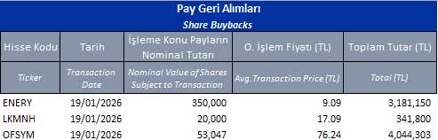 ENERY (ALIM)-(GERİ ALIM) : Şirketimizce 19.01.2026 tarihinde Borsa İstanbul'da pay başına ortalama