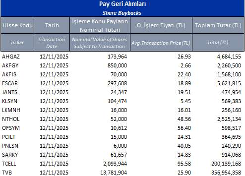 Pay geri alım programları kapsamında ilgili tarihte geri alım yapan şirketlerin listesini aşağıdaki tabloda bulabilirsiniz.