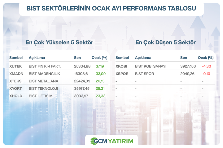 Ocak ayında sektör performanslarında genele yayılan iyimser görünüm izlendi. Ay genelinde Finansal Kiralama Faktoring, Madencilik ve Metal Ana sektörleri güçlü performanslarıyla öne çıkarken, Kobi Sanayi ve Spor sektörleri negatif ayrışan iki sektör olarak dikkat çekti.