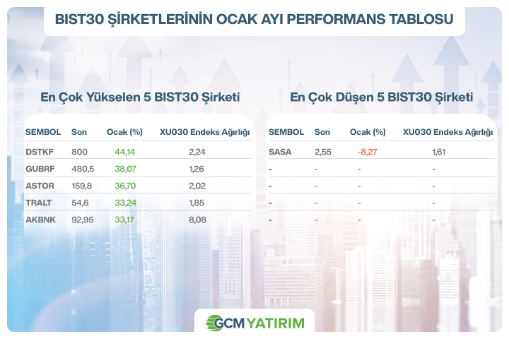 Ocak ayı şirket performanslarına bakıldığında yalnızca SASA’nın negatif ayrıştığı dikkat çekmektedir. Endeks genelinde pozitif görünümün hakim olduğu ve bu yükselişlere özellikle şirket bazlı haber akışlarının etkili olduğu ay boyunca izlendi.