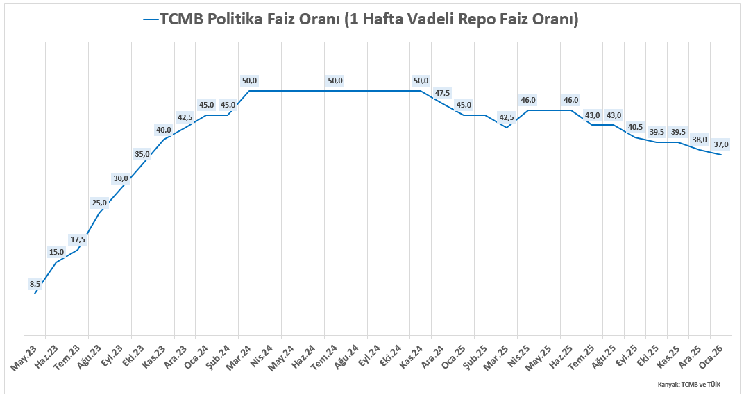 Faiz tarafına baktığımızda ise, TCMB 22 Ocak 2026 faiz kararında politika faizini 38’den 37’ye indirerek ölçülü bir gevşeme adımı attı ve koridoru da aşağı çekti. Gerekçede “dezenflasyon sürüyor ama riskler bitmedi” tonu öne çıkıyor. Aralık’ta enflasyonun ana eğiliminde gerileme vurgulanırken, Ocak’ta gıda kaynaklı aylık enflasyonda artış beklendiği belirtiliyor. Talep koşullarının dezenflasyona desteğinin azalmış olsa da devam ettiği, beklenti ve fiyatlama davranışlarındaki iyileşmeye rağmen bu alanın hala risk taşıdığı ifade ediliyor.