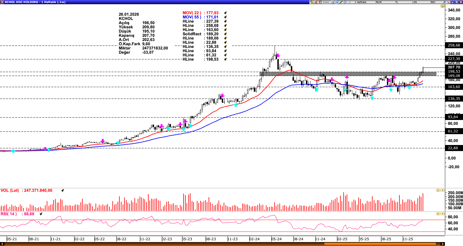 KCHOL: 2024 yılından bu yana 189,08 – 198,53 bandını aşmakta zorlanan KCHOL, son dönemde artan alım iştahıyla birlikte haftayı bu kritik bölgenin üzerinde tamamlamıştır. 198,53 seviyesi üzerindeki kalıcılığın sürmesi halinde, yukarı yönlü hareketin 227,39 direncine doğru ivme kazanması beklenebilir. Bu seviyenin aşılması durumunda ise 258,68 seviyesi bir sonraki direnç olarak gündeme gelebilir. Olası geri çekilmelerde 198,53 seviyesi kritik bir destek konumunda yer alırken, bu seviyenin altına sarkılması halinde 55 ve 22 haftalık ortalamaların (171,01 – 177,93) bulunduğu bölgeye doğru bir baskı oluşabilir. Genel teknik görünümde, söz konusu direnç bölgesinin aşılmasıyla birlikte yukarı yönlü potansiyelin güç kazandığı değerlendirilebilir.