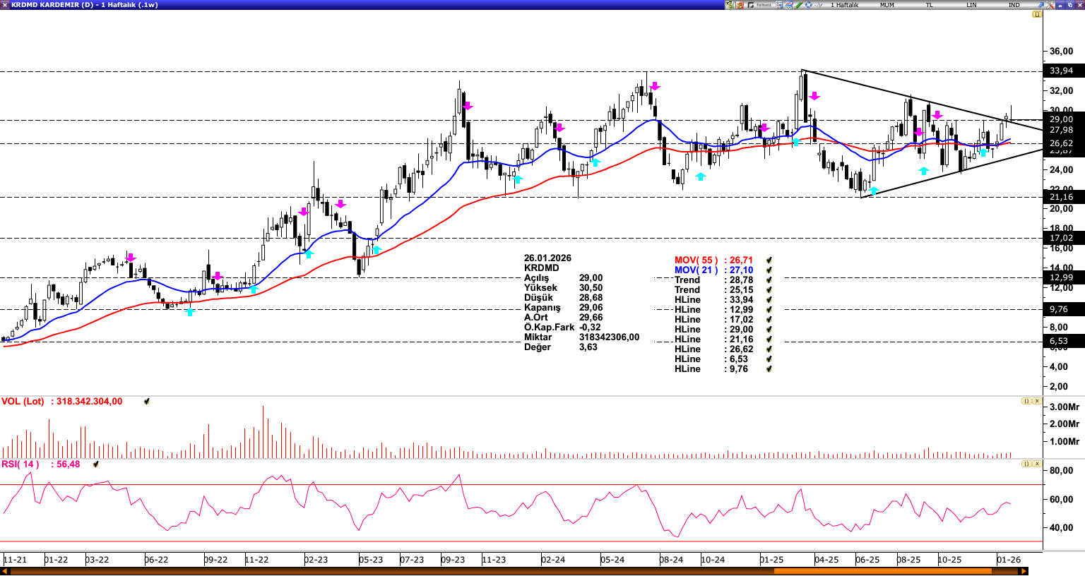 KRDMD: 2025 yılı boyunca baskılı fiyatlamalarla sıkışık bir görünüm sergileyen KRDMD, düşen trend üzerinde fiyatlamasıyla dikkat çekmektedir. Yukarı yönlü hareketin devamlılığı açısından 29,00 seviyesi kritik bir eşik konumunda bulunurken, bu seviye üzerinde kalıcılık sağlanması halinde 33,94 seviyesine doğru ivmelenme görülebilir. Olası geri çekilmelerde 29,00 seviyesinde oluşacak fiyat reaksiyonu yakından izlenecektir. Bu seviyenin altına sarkılması durumunda ise 55 ve 21 haftalık hareketli ortalamaların (26,71 – 27,10) bulunduğu bölge, güçlü bir destek alanı olarak öne çıkmaktadır. Genel görünümde, ortalamalar (26,71 – 27,10) üzerindeki fiyatlama korunmaya devam ettiği sürece pozitif görünümün baskın olduğu söylenebilir.