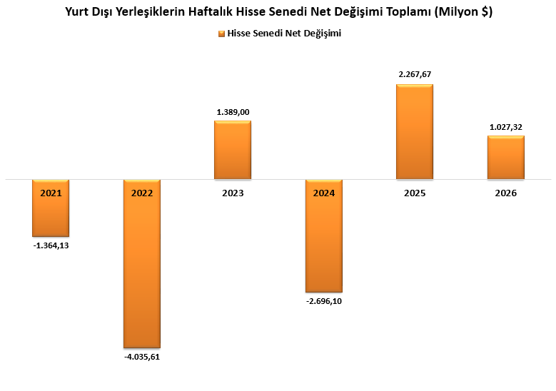 Yılbaşından bu yana bakıldığında, hisse senetlerinde 1,02 milyar dolar, tahvil piyasasında ise 3,50 milyar dolar net giriş kaydedildi. 2025’teki 2,26 milyar dolarlık girişin ardından, 2026 yılında da hisse tarafında girişlerin devam etmesi piyasa görünümü açısından olumlu bir sinyal vermektedir.