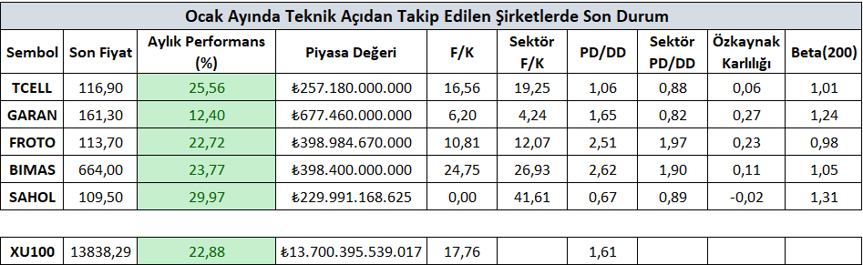 Ocak ayına yönelik paylaşmış olduğumuz şirketlerin ilgili ay sergilediği performanslara ulaşacağınız tablo aşağıdaki gibidir.