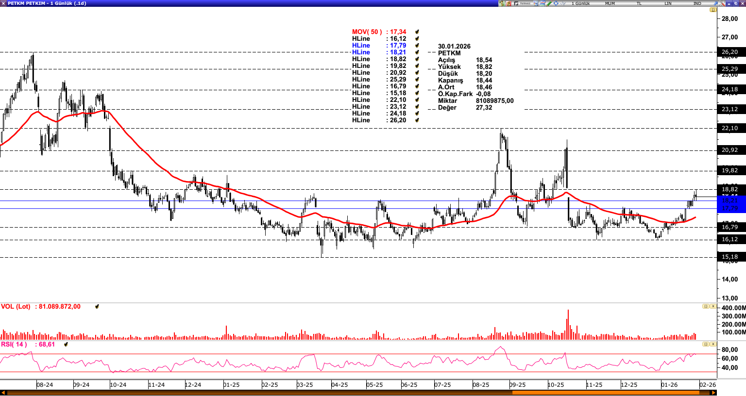 PETKM: Son dönemde baskılı bir fiyatlama sergileyen PETKM, 50 günlük ortalamanın (17,34) üzerine çıkarak pozitif bir ivme yakalamıştır. Bu hareketin devamlılığı açısından 18,21 seviyesi üzerindeki fiyatlama yakından izlenmektedir. Söz konusu seviye üzerinde kalıcılık sağlanması halinde, 19,82 ve 20,92 seviyelerine doğru yükseliş eğiliminin sürmesi beklenebilir. Olası geri çekilmelerde 18,21 seviyesi güçlü bir destek konumunda bulunurken, bu seviyenin altına sarkılması durumunda 50 günlük ortalamaya (17,34) doğru artan bir baskı oluşabilir. Genel görünümde, 50 günlük ortalama (17,34) üzerinde kalındığı sürece pozitif görünümün korunduğu söylenebilir.
