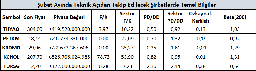 Şubat ayı dinamiklerinde teknik göstergelerle uyumlu çalışabileceğini düşündüğümüz şirketlere yönelik genel düşüncelerimizi raporumuzda ayrıntılı bir şekilde sizlere teknik analiz bölümünde paylaştık. Bu şirketlere yönelik genel bilgilere yukarıdaki tablodan ulaşabilirsiniz.