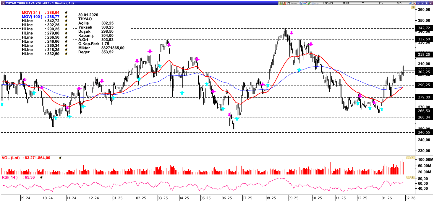THYAO: Son dönemde 34 günlük ortalamanın (288,64) üzerine çıkarak baskılı fiyatlamalarından kurtulan THYAO, yükseliş ivmesini sürdürmektedir. 302,25 seviyesi üzerinde fiyatlamaların devam etmesi halinde 318,28 seviyesine hareket devam edebilir. Bu seviyenin de aşılması 332,50 direncini gündeme getirebilir. Olası geri çekilmelerde 34 ve 100 günlük ortalama (288,64 – 288,77) bölgesi güçlü destek olarak izlenirken altında fiyatlamalar baskıyı 279,00 seviyesine taşıyabilir. Genel görünümde ortalamalar (288,64 – 288,77) üzerinde pozitif seyrin hakim olduğu söylenebilir.