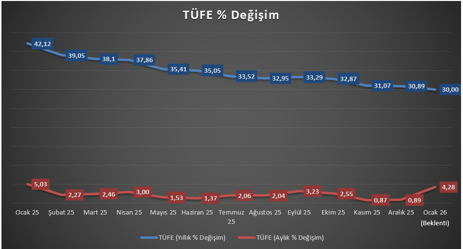 Piyasa tarafında beklenti, Ocak ayında aylık enflasyonun Aralık ayına kıyasla daha yüksek bir seviyede oluşacağı yönünde. Bloomberg anketine göre piyasa medyan beklentisi aylık enflasyonun %4,28, yıllık enflasyonun ise %30,00 seviyesinde açıklanması yönünde şekillenmiş durumda. Buna karşılık, baz etkisinin katkısıyla yıllık enflasyonda sınırlı bir geri çekilmenin korunması mümkün görünüyor.