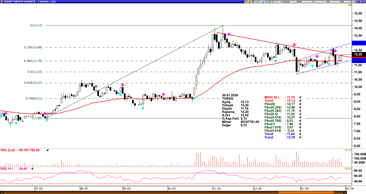 TURSG: Bir süredir düşen trend altında baskılı bir fiyatlama sergileyen TURSG, 55 günlük ortalamadan (11,79) aldığı destekle trend üzerine geçmeyi başarmıştır. Trend üzerindeki fiyatlamanın korunması halinde, yukarı yönlü hareketin 12,68 seviyesine doğru ivme kazanması beklenebilir. Bu seviyenin aşılması durumunda ise yükseliş momentumunun güçlenerek 14,17 direncinin gündeme gelmesini sağlayabilir. Olası geri çekilmelerde 55 günlük ortalamanın (11,79) bulunduğu bölge kritik bir destek eşiği olarak izlenirken, bu seviyenin altına sarkılması halinde 11,02 seviyesi yeniden gündeme gelebilir. Genel teknik görünümde, 55 günlük ortalama (11,79) üzerinde kalındığı sürece pozitif eğilimin korunduğu değerlendirilmektedir.