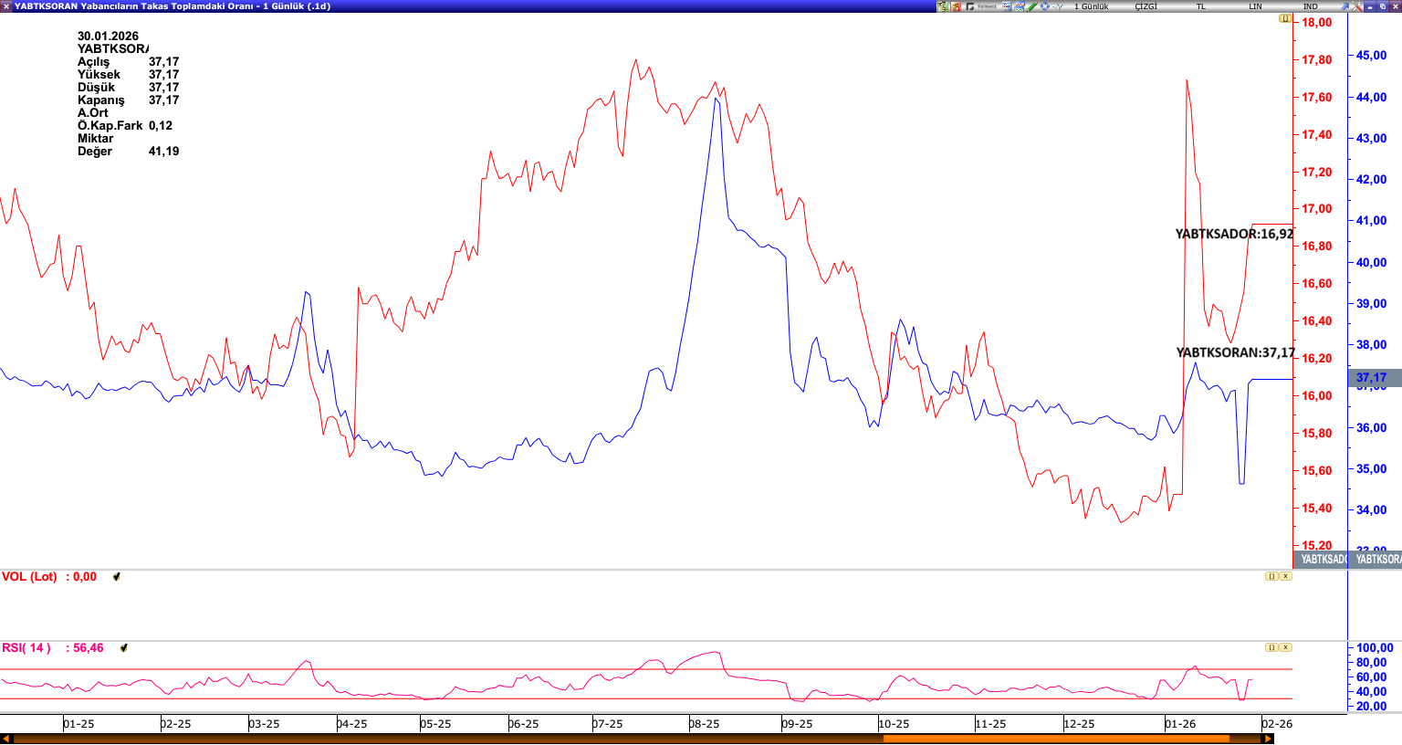 2026 yılının ilk ayı geride kalırken, yabancı takas oranlarında kademeli bir toparlanma dikkat çekmektedir. Ocak ayı itibarıyla yabancı takas oranı %37,17 seviyesinde bulunmaktadır. Genel çerçevede, yabancı yatırımcı tarafında güçlü ve kalıcı bir dönüşten söz etmek için henüz erken olmakla birlikte, mevcut tablo yabancı kaynaklı oynaklığın azaldığına ve piyasaların toparlanma sinyali verdiğini düşündürmektedir.