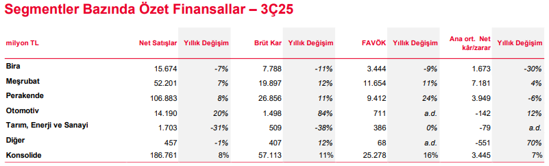 2025 yılının üçüncü çeyreğinde Otomotiv Grubu’nun satış gelirleri yıllık bazda %19,8 artarak 14,2 milyar TL oldu. Yılın ilk dokuz ayında ise gelir büyümesi %11,3 olarak gerçekleşti ve satış gelirleri 45,9 milyar TL’ye ulaştı. Burak Başarır şöyle konuştu: “Çelik Motor binek araç segmentinde pazar payını artırarak gelir büyümesi elde etti. Anadolu Isuzu, üçüncü çeyrekte kamyonet üretim ve satış faaliyetlerine tekrar başladı ve segmentin gelir büyümesine önemli katkı sağladı. Operasyonel giderlerin, disiplinli yönetimin etkisiyle büyük oranda sabit kalmasıyla birlikte segment FAVÖK’ü yılın üçüncü çeyreğinde kayda değer bir iyileşme kaydetti.”