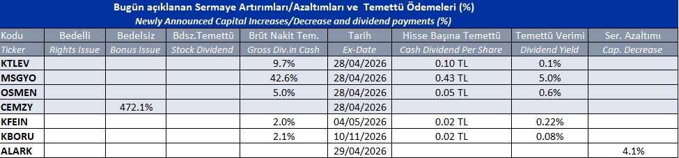 BİST100 endeksi, Cuma günkü işlemlerde %0,51 oranında yükseliş ile günü 14.409 puandan tamamladı. Endeksin günlük hareket bandı 14.212–14.409 aralığında gerçekleşti. İşlem hacmi 169,52 milyar TL ile önceki güne kıyasla %2,0 oranında artış gösterdi. Dünkü işlemlerde bankacılık endeksi %1,31 oranında değer kaybederken, sınai endeksi ise %1,23 oranında değer kazandı. Endekse puan olarak en çok katkıyı DSTKF, ASTOR ve TUPRS sağlarken, endeksi en çok negatif etkileyen hisseler ASELS, AKBNK ve ISCTR oldu.