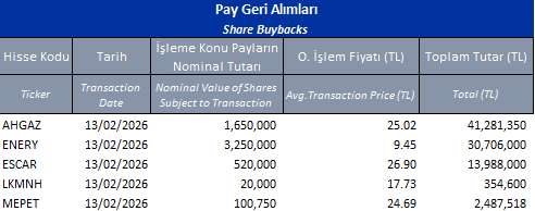 ENERY (ALIM)-(GERİ ALIM) : Şirketimizce 16.02.2026 tarihinde Borsa İstanbul'da pay başına ortalama
