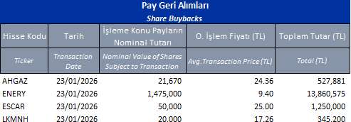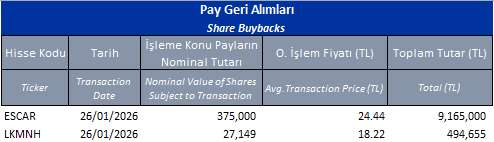 ESCAR (ALIM)-(GERİ ALIM) : Şirketimizce 26.01.2026 tarihinde Borsa İstanbul'da pay başına ortalama