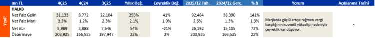 Halkbank’ın son çeyrekte 6,5 milyar TL net kâr elde ederek, 2025 yılını toplam 26,7 milyar TL net kâr rakamıyla tamamlamasını öngörüyoruz. Son çeyrekte gerçekleşen vergi düzenlemelerinin etkisiyle, bankanın yılı %18’e yaklaşan bir efektif vergi oranıyla kapatmasını beklemekteyiz.