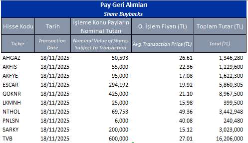 Pay geri alım programları kapsamında ilgili tarihte geri alım yapan şirketlerin listesini aşağıdaki tabloda bulabilirsiniz.
