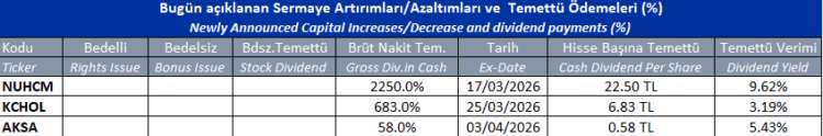 KCHOL: KCHOL, 25 Mart tarihinde hisse başına net 5,8055 TL temettü dağıtılmasına karar verildiğini duyurdu.