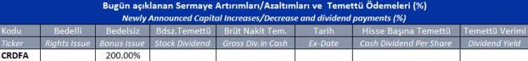 Gün içinde çıkmış veya bu sabah seans açılmadan önce açıklanmış sermaye artırımları ve temettü ödemeleri aşağıdaki tabloda görüntülenmektedir.