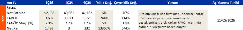 Selçuk Ecza 3Ç16'da 60 milyon TL net kar açıkladı. Açıklanan net kar bizim beklentimiz olan 63 milyon TL ve piyasa beklentisi olan 62 milyon TL'ye paralel gerçekleşti. Ciro yıllık bazda %16 artarak 3Ç16'da 2,043 milyon TL oldu (bizim beklentimiz 2,050 milyon TL ve piyasa ortalama beklentisi 2,038 milyon TL). Ciroda yaşanan yıllık artışın temel sebebi ilaç piyasasında yaşanan ciddi büyüme ve Selçuk Ecza'nın yüksek pazar payından (~%40) kaynaklanmaktadır. Brüt kar marjı 3Ç16'da Haziran ayında ilaç fiyatlarına gelen artış sebebiyle yıllık bazda %0.6 ve çeyreklik bazda %0.7 artarak %8.3 oldu. 3Ç16 sonuçlarının hisse üzerinde bugün nötr bir etki yaratmasını bekliyoruz. 12 aylık hedef fiyatımız olan 3,45 TL ile Selçuk Ecza için "Endeksin Üzerinde" getiri beklentimiz devam etmektedir.