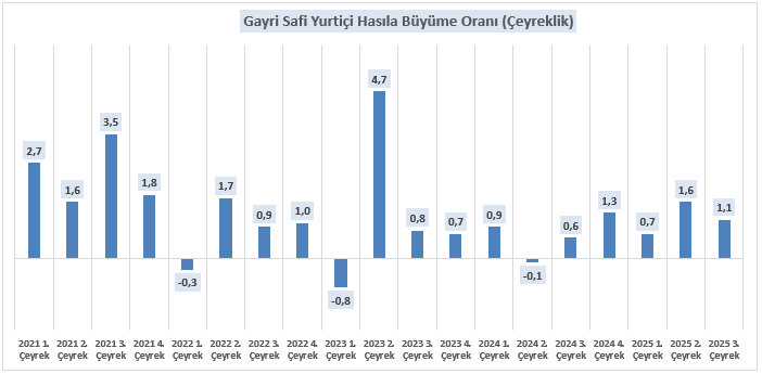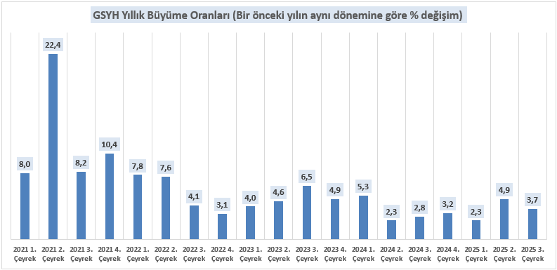 Türkiye ekonomisi, 2025 yılının üçüncü çeyreğinde büyüme eğilimini sürdürerek yıllık bazda %3,7, bir önceki çeyreğe kıyasla ise %1,1 oranında büyüme kaydetmiştir. Söz konusu performans, ekonomik aktivitedeki toparlanmanın devam ettiğine işaret ederken, iç ve dış talep dinamiklerinin büyümeyi desteklediğini göstermektedir.