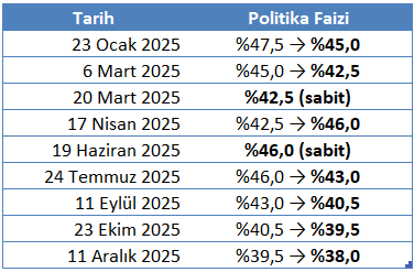 2025 yılı boyunca TCMB politika faizi dalgalı ancak yılın ikinci yarısında ağırlıklı olarak aşağı yönlü bir seyir izledi. Yılın ilk yarısında sınırlı indirimlerin ardından Nisan ayında güçlü bir artış yapılırken, yaz aylarından itibaren faizlerde kademeli indirim süreci öne çıktı. Aralık ayında gerçekleştirilen 150 baz puanlık indirimle politika faizi yılı %38,0 seviyesinde tamamladı. 22 Ocakta ise 2026 yılının ilk Para Politikası Kurulu Toplantısı gerçekleşecek. Son dönemde enflasyondaki ılımlı seyrin korunması ve TCMB’nin karar metinlerinde vurguladığı temkinli yaklaşım dikkate alındığında, 22 Ocak toplantısında politika faizinde sınırlı bir indirimin gündemde olması daha olası görünüyor.