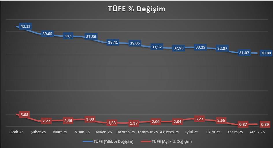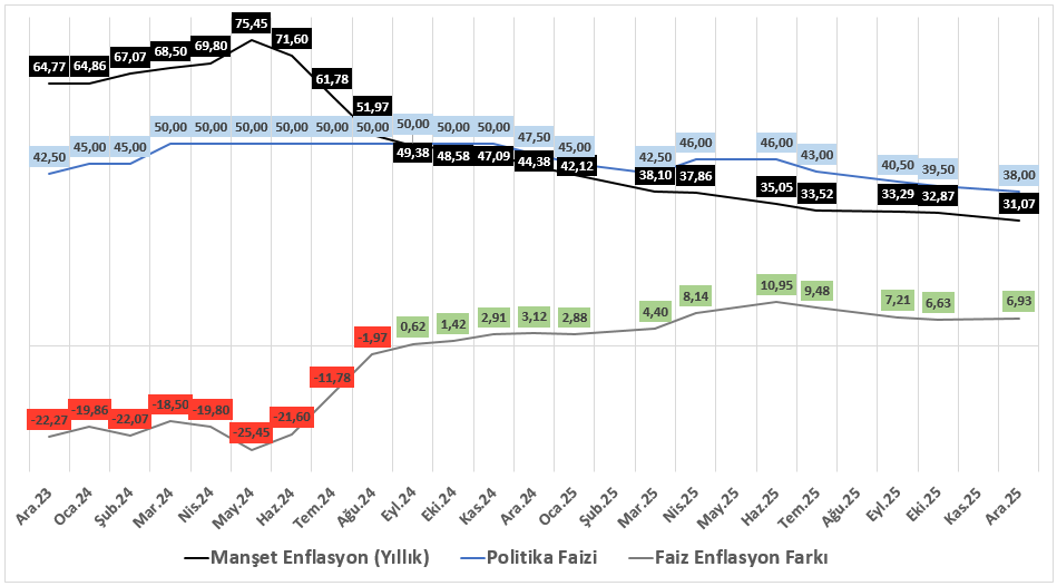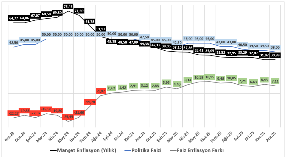 Kasım ayında aylık enflasyonun beklentilerin altında gerçekleşmesiyle birlikte yıllık enflasyonun %31 seviyelerine gerilemesi, dezenflasyon sürecinin devam ettiğine işaret etti. Aralık ayına ilişkin gerçekleşmelerin de piyasa medyan tahminlerinin hafif altında kalarak aylık %0,89, yıllık %30,89 seviyesinde oluşması, yıl sonu enflasyonunun TCMB’nin Enflasyon Raporu’nda öngördüğü %31–33 aralığıyla uyumlu bir noktada tamamlandığını gösteriyor. Bu tablo, 2025’in para politikası açısından hedeflere yakın bir kapanış yaptığını ve enflasyon görünümünde belirgin bir bozulma olmadığını ortaya koyuyor.