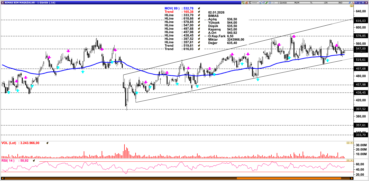 BIMAS: Son süreçte yaşadığı baskıyla 89 günlük ortalama (532,78) bölgesine gerileyen BIMAS, bu bölgeden destek almaktadır. Hareketin devamlılığı açısından 547,00 seviyesi ilk önemli direnç konumunda bulunurken, aşılması durumunda 578,85 seviyesine doğru pozitif ivme oluşabilir. Olası geri çekilmelerde 89 günlük ortalama (532,78) seviyesi ile yükselen kanal desteği (519,61) kritik destek bölgeleri olarak izlenebilir.
