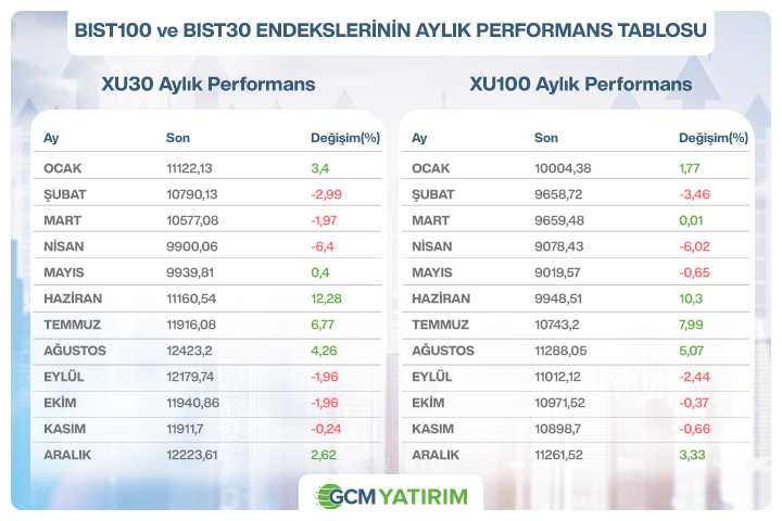 BIST100 ve BIST30 endekslerinde yıl genelinde dalgalı bir seyir izlenirken, Haziran–Ağustos döneminde her iki endekste de belirgin bir toparlanma öne çıktı. Bu süreçte BIST30’un BIST100’e kıyasla daha güçlü performans sergilemesi dikkat çekti. Son çeyrekte ise fiyatlamalar daha yatay ve seçici bir görünüm kazanırken, Aralık ayı her iki endeks için de pozitif kapanışla tamamlandı.