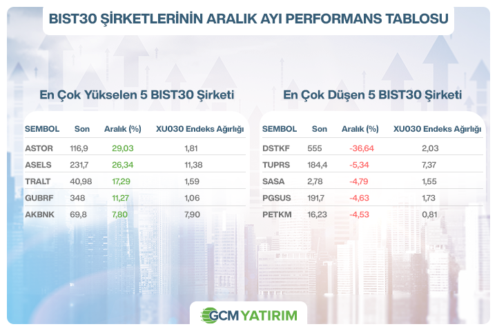 Aralık ayı şirket performanslarında belirgin bir ayrışma öne çıktı. Ay boyunca en iyi performans sergileyen hisseler ASTOR, ASELS ve TRALT olurken, DSTKF, TUPRS ve SASA en zayıf performans gösteren şirketler arasında yer aldı. Endeks genelinde yön arayışı sürerken, fiyatlamaların ağırlıklı olarak hisse ve sektör bazlı gerçekleştiği görüldü.
