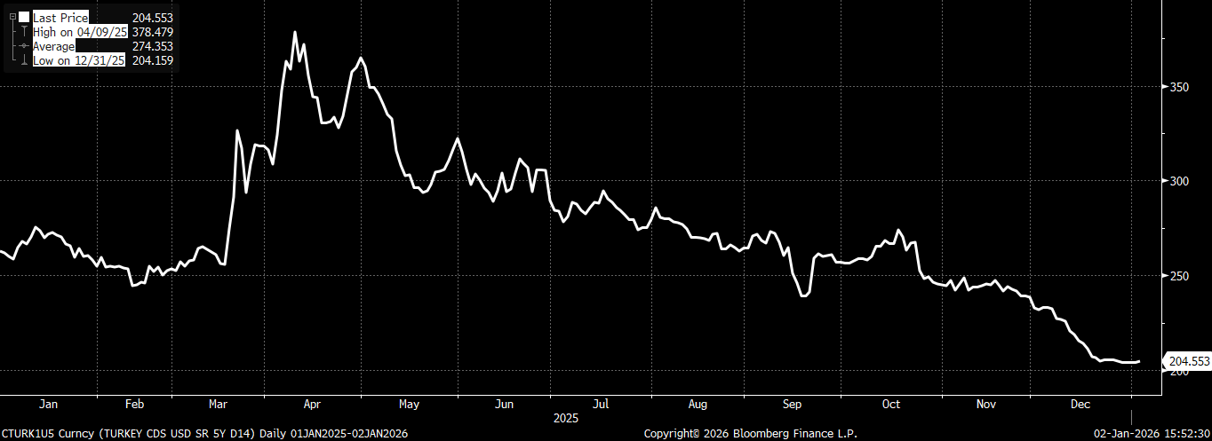 2025 yılı boyunca Türkiye’nin risk priminde belirgin ve yapısal bir iyileşme izlendi. Nisan ayında 378,47 seviyesine kadar yükselen 5 yıllık CDS, yılın ikinci yarısında 204,15 seviyesine kadar gerileyerek yılın en düşük düzeyini gördü. Bu düşüş yalnızca küresel risk iştahındaki toparlanmayı değil, daha çok para politikasında öngörülebilirliğin artması, dezenflasyon beklentilerinin güçlenmesi ve politika yönünde sert bir geri dönüş riskinin azalmasını yansıtıyor. CDS’in 200 baz puan bandına yaklaşması, Türkiye algısının yüksek risk kategorisinden daha dengeli bir çerçeveye doğru evrildiğine işaret ederken, kredi derecelendirme kuruluşları açısından da olumlu bir referans noktası oluşturuyor.
