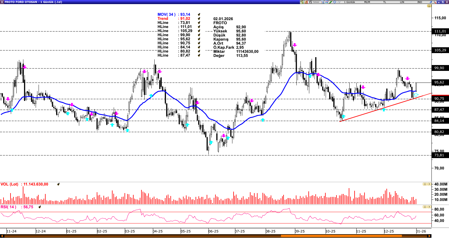 FROTO: Son süreçte ulaştığı 99,90 direnç seviyesinden geri çekilme yaşayan FROTO, yükselen trend desteğinden (91,02) aldığı destekle yeniden 34 günlük ortalama (93,14) üzerinde fiyatlama reaksiyonu sergilemektedir. Ortalama üzerinde seyir sürdükçe 99,90 ve 105,29 seviyelerine yönelik pozitif ivme devam edebilir. Olası baskılanmalarda 34 günlük ortalama (93,14) ve trend desteği (91,02) güçlü destek bölgesi olarak takip edilebilir.