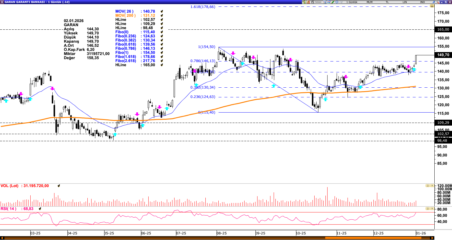 GARAN: Bir süredir 26 günlük ortalama (140,78) yakınında seyrini sürdüren GARAN, topladığı güçle birlikte 146,13 direnci üzerine geçmiştir. İlgili seviye üzerinde kalıcılık sağlanması halinde 154,50 direncine doğru pozitif hareketin sürmesi beklenebilir. Bu seviyenin aşılması durumunda ise 165,00 seviyesi gündeme gelebilir. Olası baskılanma durumunda 146,13 seviyesi izlenirken, bu seviyenin altındaki fiyatlamalar 26 günlük ortalamayı gündeme getirebilir. Genel görünümde 26 günlük ortalama (140,78) üzerinde pozitif seyrin korunduğu söylenebilir.