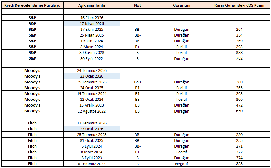 2026 yılına girerken beklentiler temkinli iyimserliğini koruyor. 23 Ocak 2026 değerlendirmelerinde Fitch ve Moody’s tarafında baz senaryo, mevcut not ve görünümlerin korunması yönünde. Enflasyondaki düşüş eğilimi ve sıkı para politikasının sürdürülmesi kredi profili açısından destekleyici olsa da, seviyelerin halen yüksek olması nedeniyle hızlı bir not artışı beklenmiyor. Buna karşılık CDS tarafındaki düşük seviyelerin korunması ve dezenflasyon sürecinin beklentilere paralel ilerlemesi halinde, 2026’nın ikinci yarısında daha pozitif mesajların öne çıkması mümkün görünüyor.
