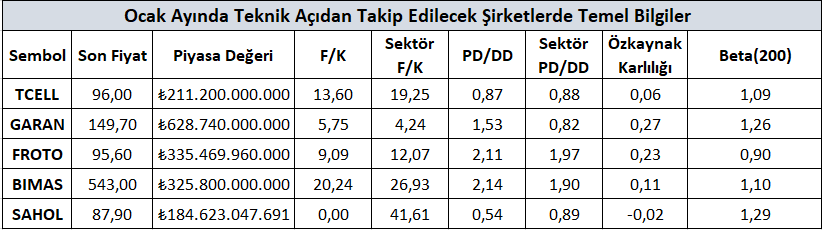 Ocak ayı dinamiklerinde teknik göstergelerle uyumlu çalışabileceğini düşündüğümüz şirketlere yönelik genel düşüncelerimizi raporumuzda ayrıntılı bir şekilde sizlere teknik analiz bölümünde paylaştık. Bu şirketlere yönelik genel bilgilere yukarıdaki tablodan ulaşabilirsiniz.
