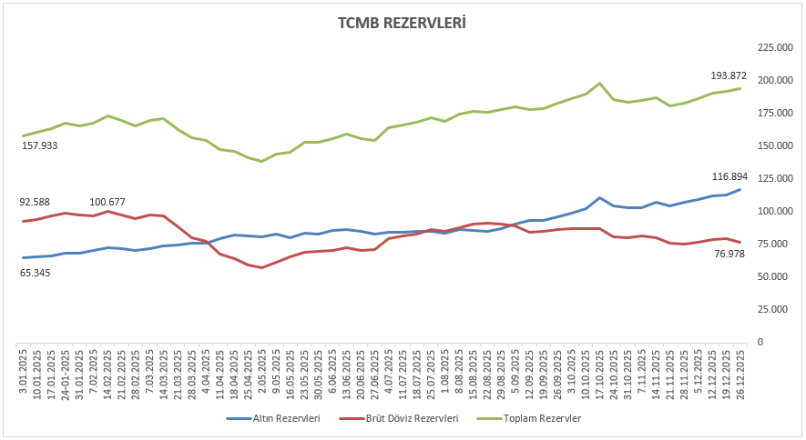 Yılın başından 26 Aralık haftasına kadar olan dönemde TCMB rezervlerinde kompozisyon bazlı belirgin bir değişim dikkat çekiyor. Altın rezervlerinde güçlü bir artış görülürken, brüt döviz rezervlerinde daha sınırlı bir gerileme söz konusu. Bu ayrışmaya rağmen toplam rezervler yıl genelinde artış eğilimini korudu.