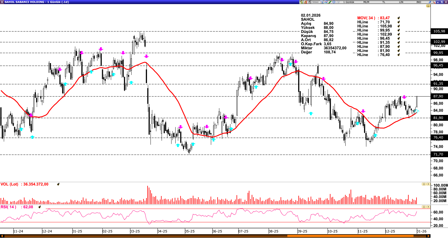 SAHOL: Son süreçte 87,90 direncinden baskı gören SAHOL, ulaştığı 34 günlük ortalamadan (83,47) aldığı destekle yeniden 87,90 seviyesine ulaşmıştır. İlgili seviye üzerinde fiyatlamalar, pozitif görünümü destekleyerek 91,35 ve 96,45 seviyelerine doğru ivmenin sürmesini sağlayabilir. Olası baskılanma durumunda 34 günlük ortalama (83,47) ve 81,90 seviyesi güçlü destek bölgesi konumunda yer almaktadır.