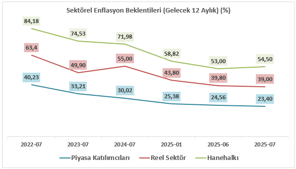 Aralık 2025 itibarıyla 12 ay sonrası yıllık enflasyon beklentileri, tüm katılımcı gruplarında bir önceki aya kıyasla gerileme eğilimi sergilemiştir. Buna göre, piyasa katılımcıları için enflasyon beklentisi 0,14 puan azalarak %23,35 seviyesine inerken, reel sektör beklentisi 0,90 puanlık düşüşle %34,80 olarak kaydedilmiştir. Hane halkı enflasyon beklentisi ise 1,34 puanlık daha belirgin bir gerilemeyle %50,90 seviyesine düşmüştür. Genel tablo değerlendirildiğinde, enflasyon beklentilerinde geniş tabanlı ve aşağı yönlü bir güncelleme olduğu görülmektedir. Bu görünüm, fiyat istikrarına yönelik algının kademeli olarak iyileştiğine işaret ederken, para politikası açısından da destekleyici bir zemin oluşturmaktadır.